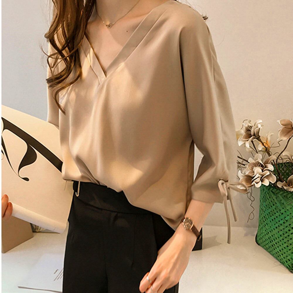 Vネックのデザインで首のラインが美しく見える。袖下にリオン付きで可愛い感がアップ