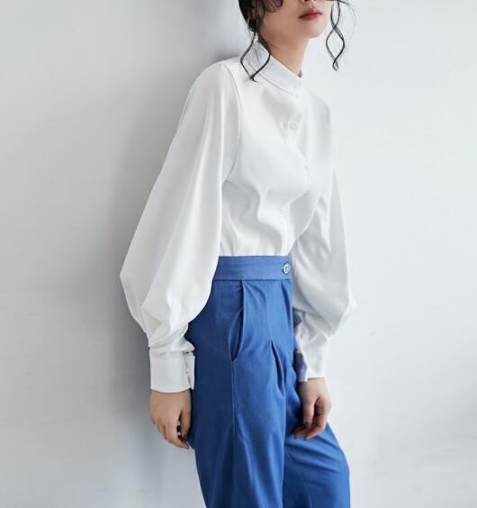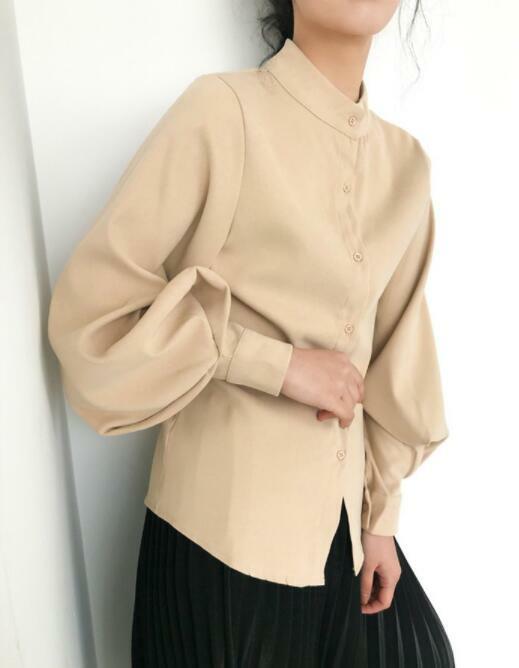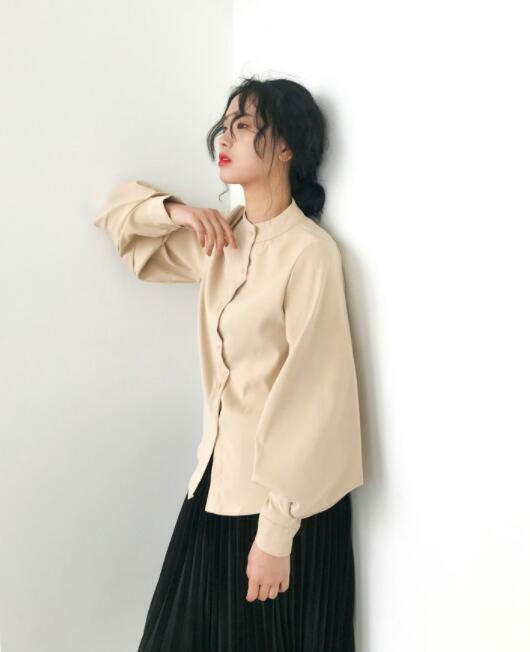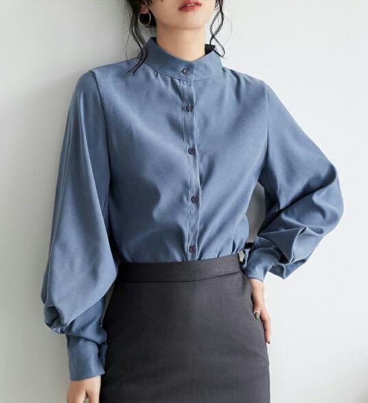 程良い袖のバルーンが美しく見せてくれるハイネックシャツブラウス