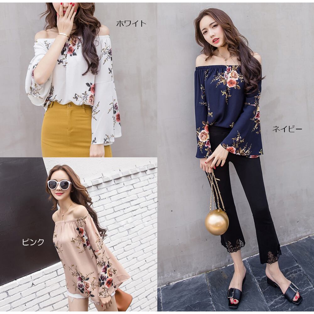 オフショルダー花柄フレアスリーブブラウス